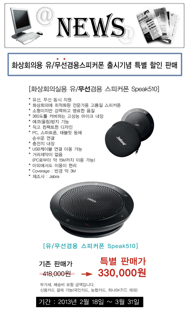 화상회의용 유/무선 겸용 스피커폰 출시기념 특별 할인 판매 작성일Date: 2014-12-19 16:41