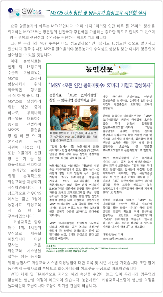 [뉴스]MSY25 club 창립 및 양돈농가 화상교육 시연회 실시 작성일Date: 2014-12-19 16:03 페이지 정보 작성자 최고관리자 조회 75,297 본문 목록 이전글[뉴스]2010.8월_팝콘잉글리쉬, 에듀오션 2014.12.19 다음글[뉴스]2010.7월_농협사료, 도드림BT 2014.12.19
