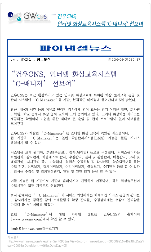 [뉴스]파이낸셜뉴스-건우CNS, 인터넷 화상교육시스템 ‘C-매니저’ 선보여 작성일Date: 2014-12-19 15:54