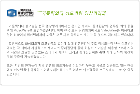 [뉴스]성모병원 전국 임상병리과 화상회의 도입 작성일Date: 2014-12-19 15:42 페이지 정보 작성자 최고관리자 조회 75,066 본문 목록 이전글[공지]VOSP Center 이전 안내 2014.12.19 다음글[공지](주)건우씨엔에스의 역사가 시작됩니다. 2014.12.19