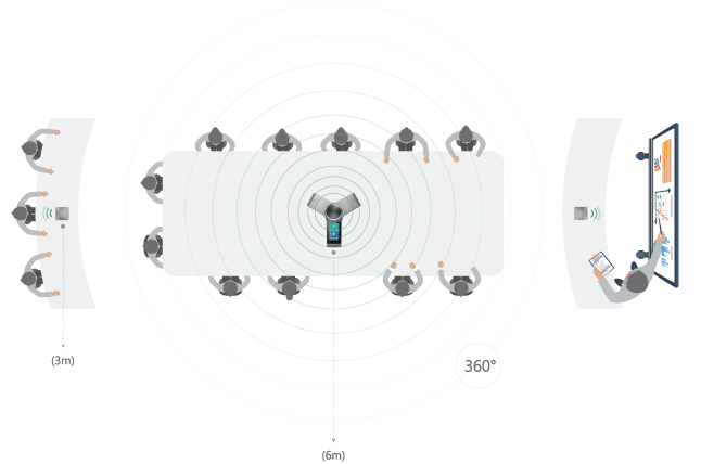 예링크 CP960은 6m, 무선 확장마이크까지 연결하면 10m 범위에서 360도 사각지대 없이 음성을 픽업합니다. 그리고 예링크의 진보된 Noise Proof Technology를 적용하여- 타이핑, 에어컨 등과 같은 배경 소음을 감소시키고