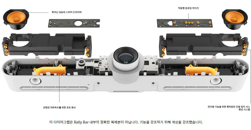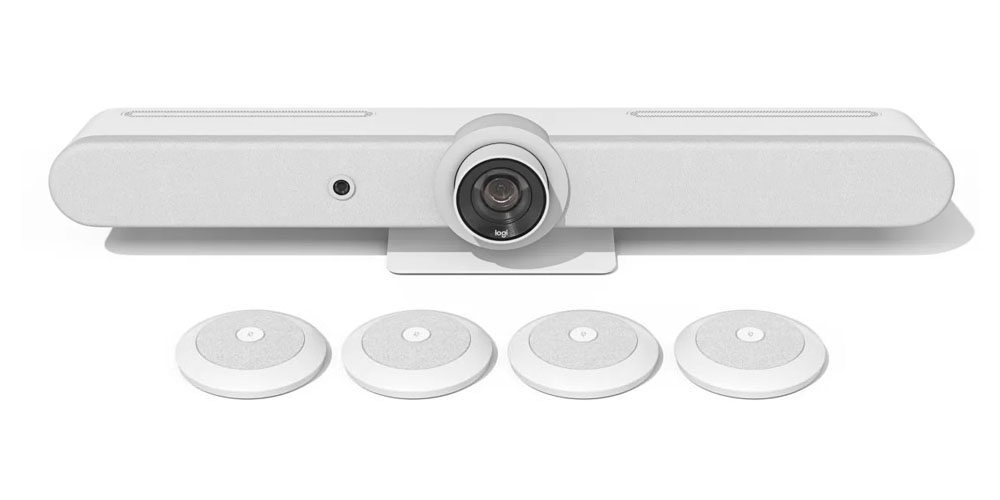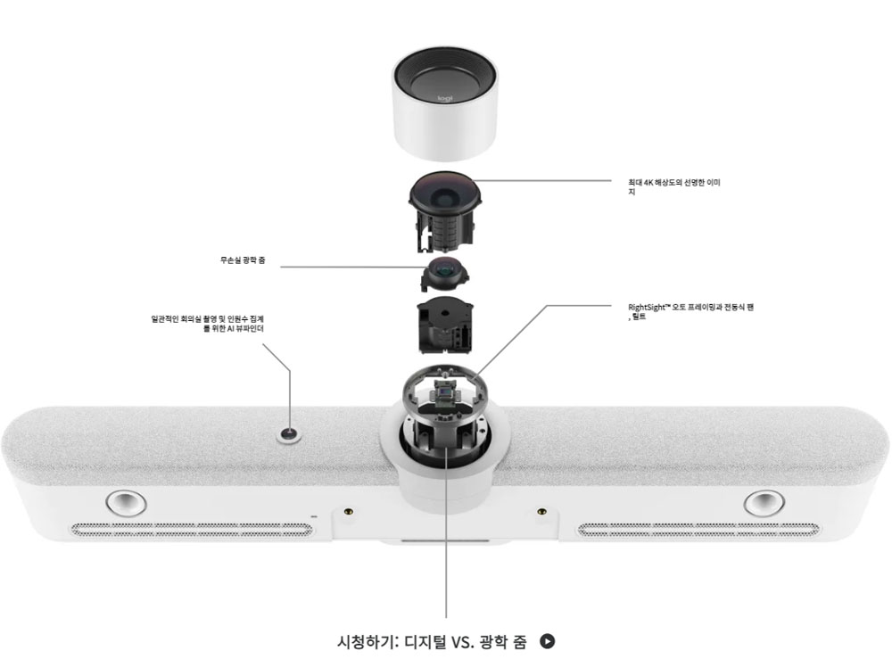 - 내장 부품: 빔포밍 마이크 6개, PTZ 카메라, 스피커 2개, AI 뷰파인더, 케이블 관리, 유지 시스템, 테이블 스탠드 로지텍 CollabOS 플랫폼