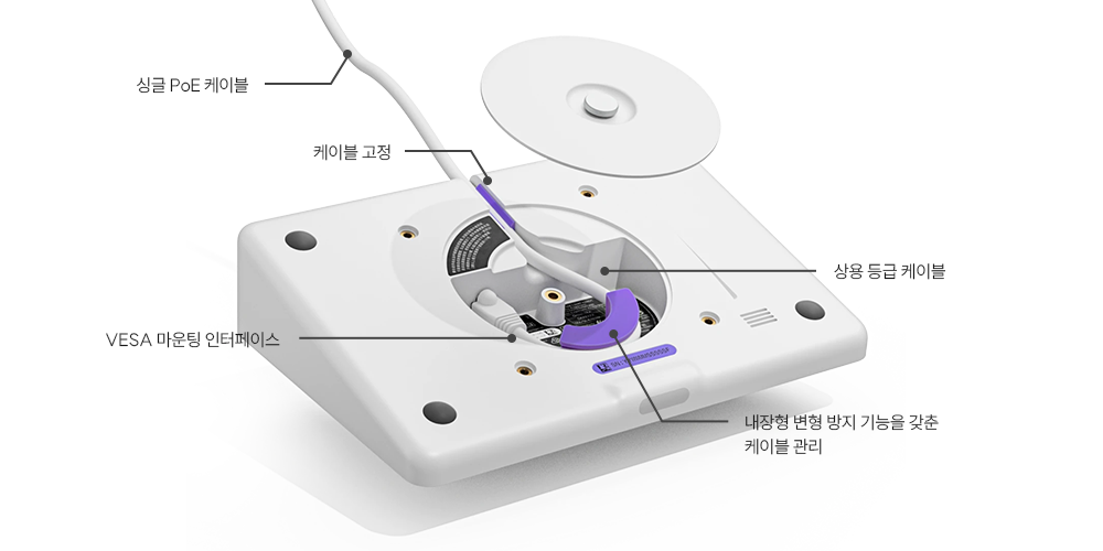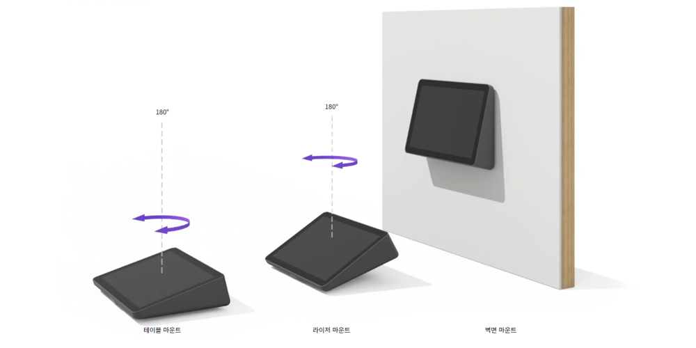 Tap IP은 표준 테이블 그로밋에 맞는 테이블 및 라이저 마운트로 회의실 어느 곳에나 설치가 가능합니다. 180° 회전이 가능하여 가시성과 편리함을 높입니다. 벽면 마운트 이용 시 소형 회의실 테이블 공간을 절약할 수 있습니다.